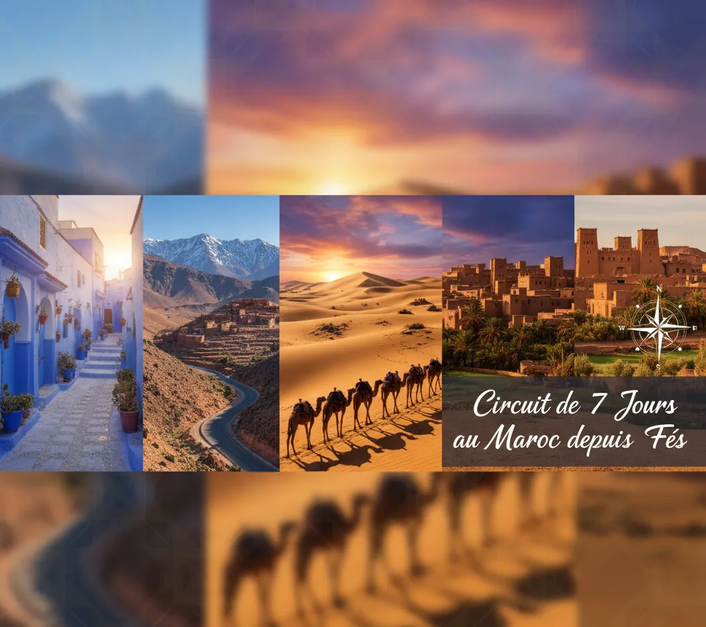 Ce circuit 7 jours Maroc depuis Fès représente l’itinéraire idéal pour découvrir la diversité marocaine en une semaine. Notre circuit de 7 jours au Maroc depuis Fès avec désert combine parfaitement culture, histoire et aventure dans un itinéraire 7 jours Maroc combiné culture et nature soigneusement équilibré. Ce voyage Sahara Merzouga et montagnes du Haut-Atlas vous garantit des souvenirs impérissables, avec une visite de Chefchaouen, Volubilis et Marrakech en 7 jours et un tour guidé Maroc 7 jours au départ de Fès mené par des professionnels.