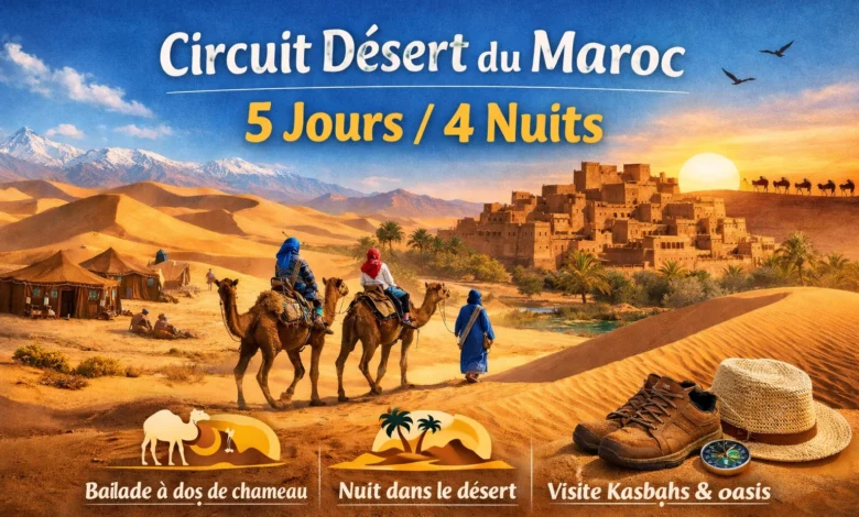 Partez pour un circuit de 5 jours dans le désert du Maroc au départ de Marrakech et vivez une expérience extraordinaire. En cinq jours et quatre nuits, vous traversez les imposantes montagnes du Haut Atlas, le col mythique de Tizi n’Tichka, la célèbre Kasbah d’Aït Ben Haddou classée UNESCO, et la fascinante ville de Ouarzazate avant de plonger dans l’immensité saharienne de Merzouga.