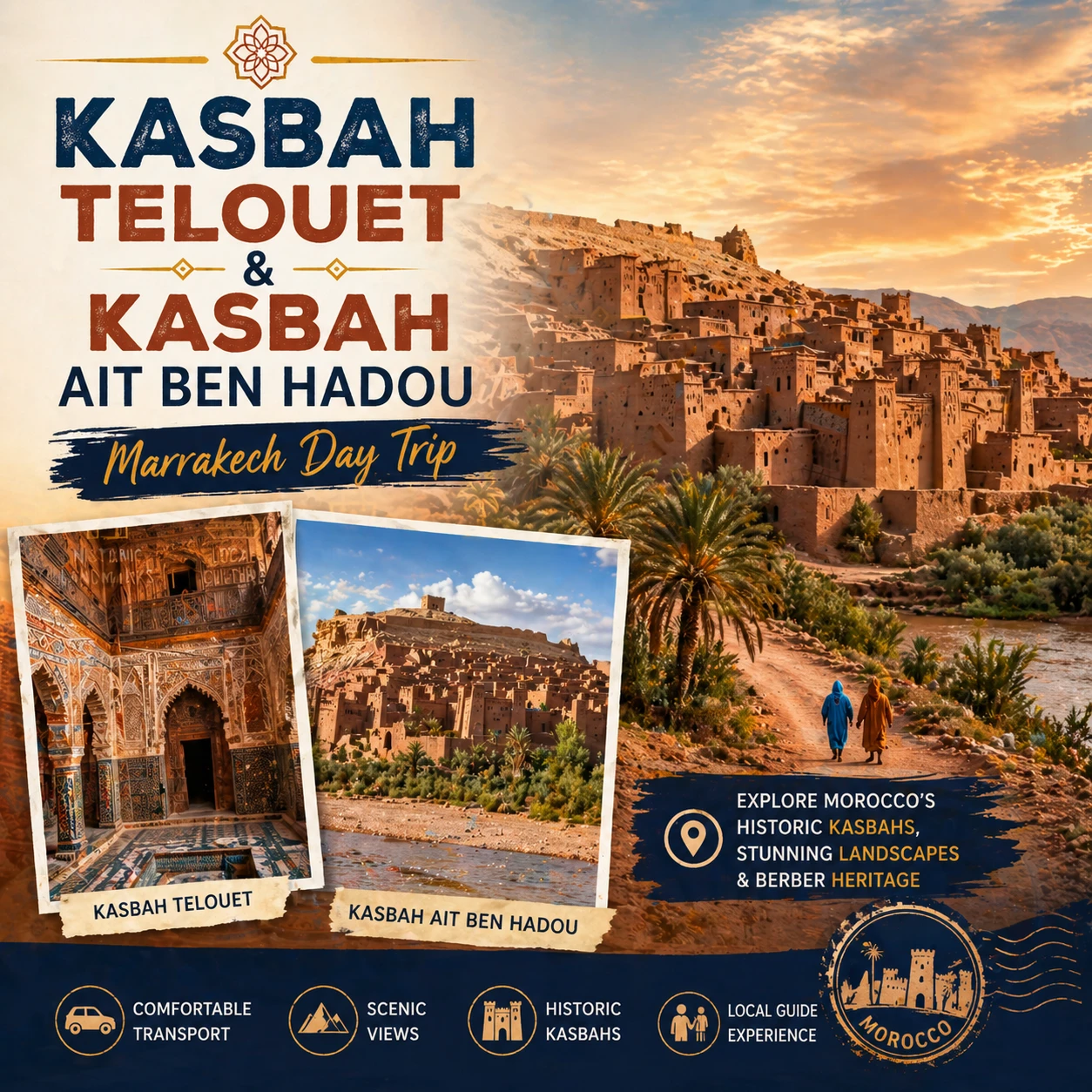 The return to Marrakech follows the ancient Caravan Route through the Telouet Valley, where the atmospheric Telouet Kasbah stands as a monument to French-Moroccan history. Surrounded by palm, fig, and olive trees, its ornate interiors — original zellij tilework, preserved silks, and grand ceremonial halls — tell the story of the powerful El Pacha Glaoui family.